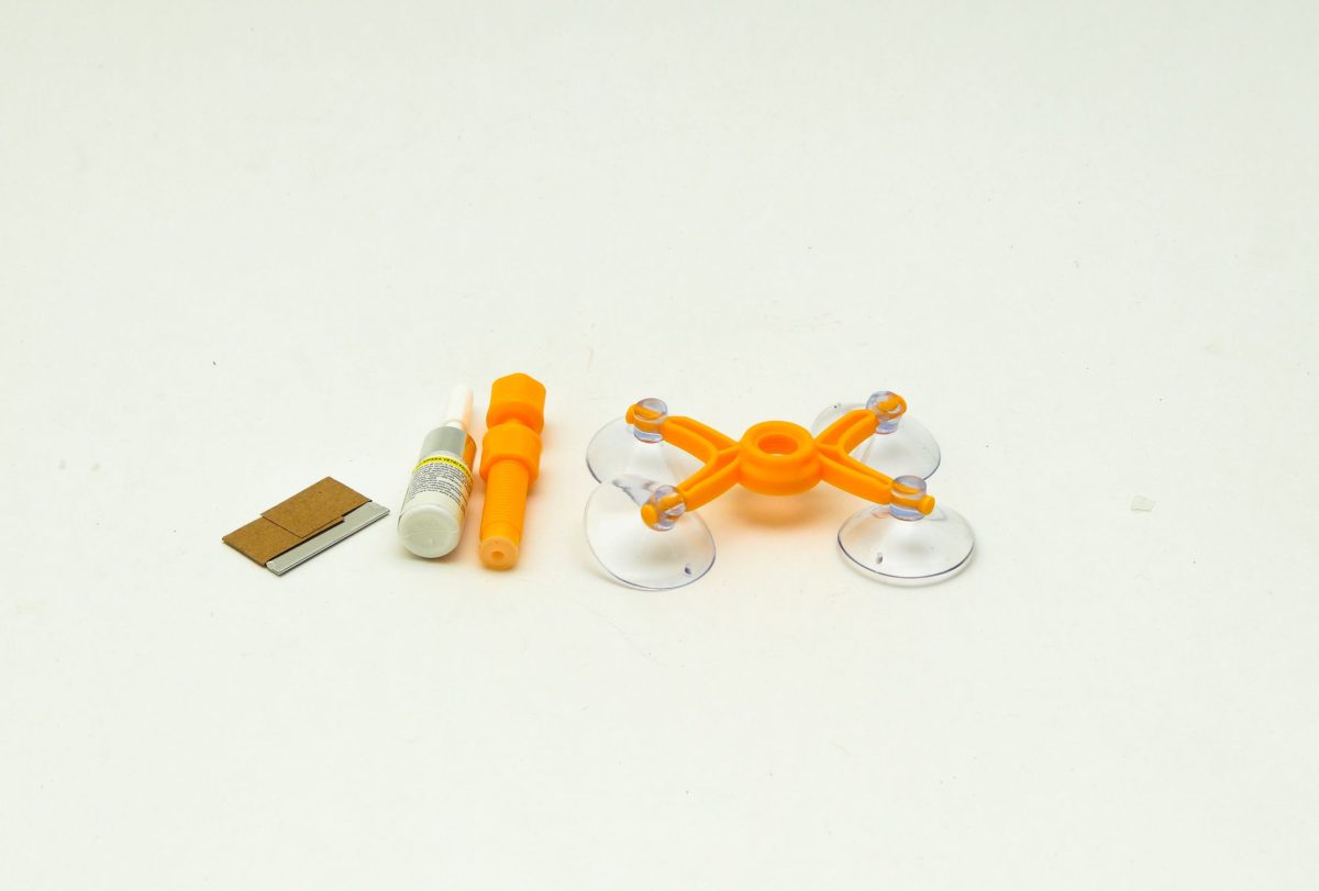 • 1 عبوة صغيرة شبه القطرة فيها مادة صمغية وهي المادة المسؤولة عن تصليح زجاج العربية.